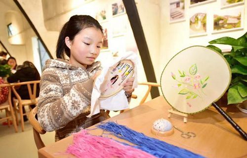 冬日里,天气虽然阴冷,但是吴兴区漾西集镇书吧里却热气腾腾。来自漾西学校的近百名孩子正在这里参加流动少年宫活动,学习刺绣技艺。只见一个扎马尾的小朋友正聚精会神的绣一朵向日葵,随着一针一针扎绣,一朵金黄色的向日葵跃然纸上。